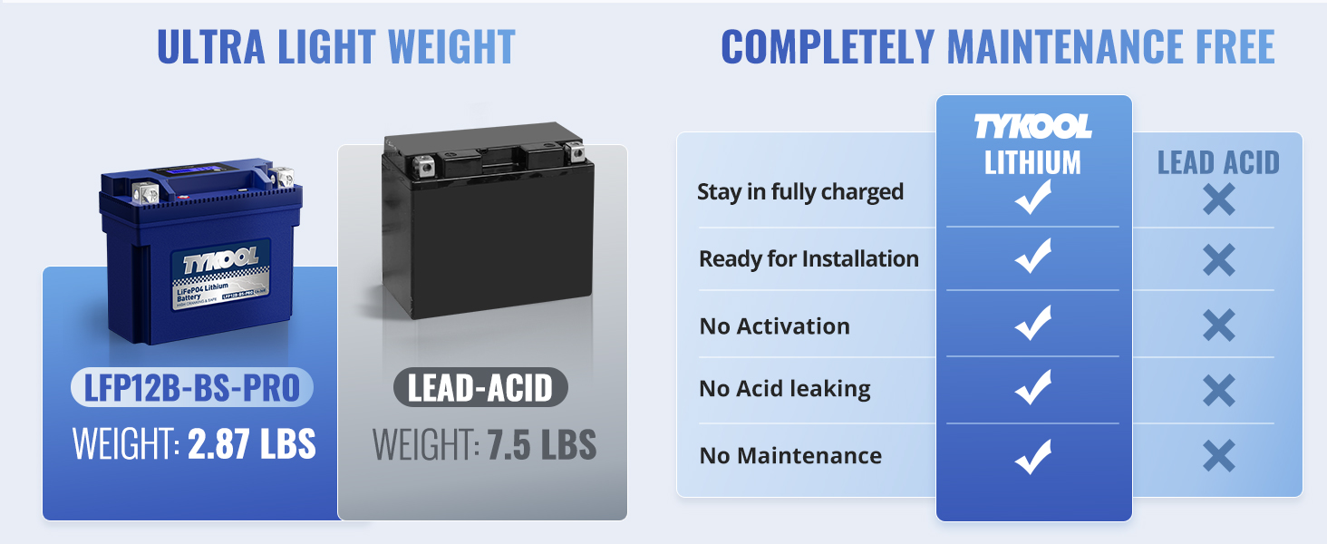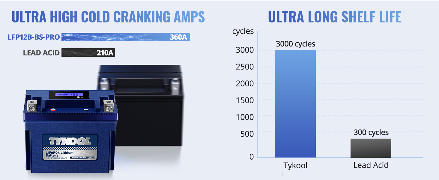 This TYKOOL lithium battery delivers an impressive 360 cold cranking amps (CCA), ensuring reliable starting power even in the harshest cold weather conditions. Compared to traditional lead-acid batteries, which offer only 210 CCA, it provides significantly more strength for your motorcycle. Additionally, this battery is designed to last up to 3000 cycles, far outlasting the typical 300-cycle lifespan of lead-acid batteries, making it a smart and durable choice for long-term use.