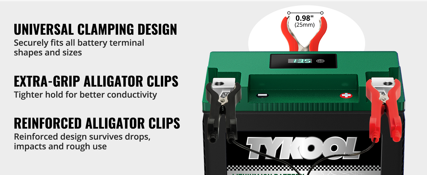 Built with extra-grip, reinforced alligator clips for a tighter, more stable connection. This lithium battery charger 12v delivers improved conductivity and durability, handling drops, impacts, and tough everyday use with confidence.