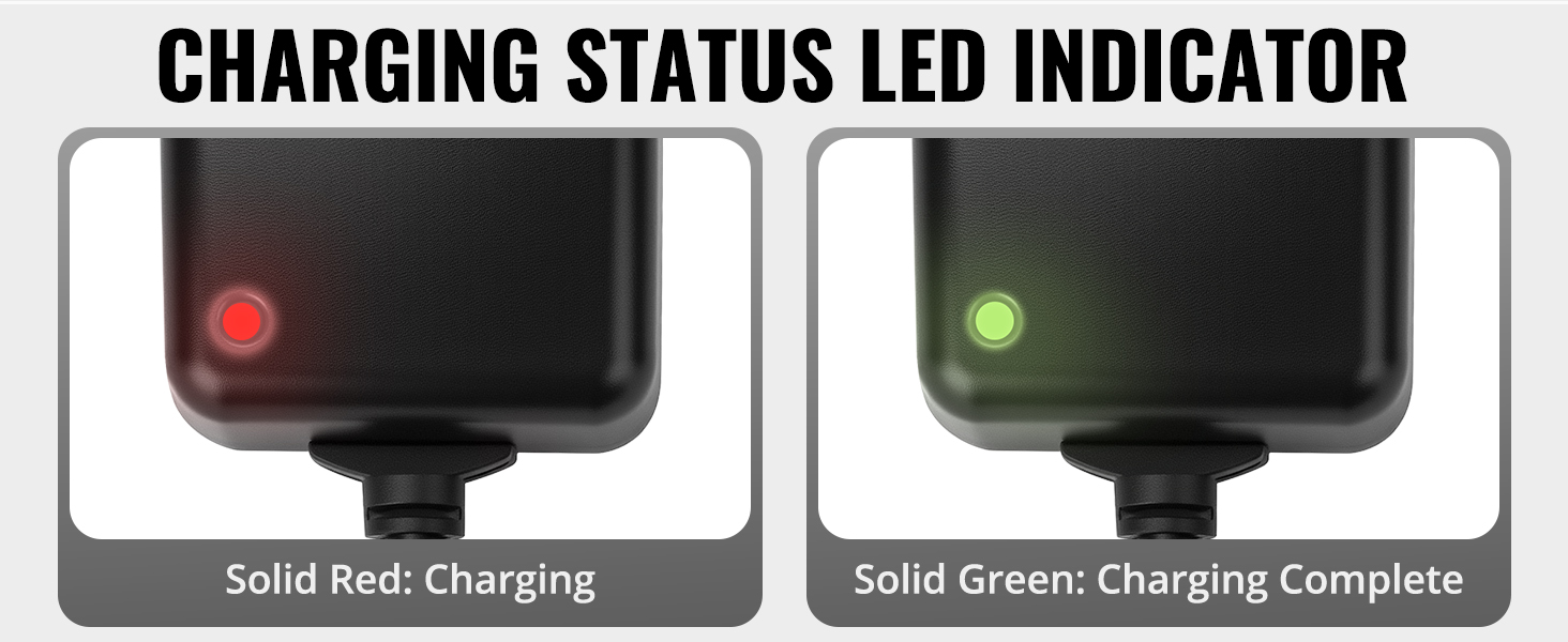 Monitor your battery easily with the LED lights—solid red means charging is in progress, while solid green indicates the battery is fully charged for safe and convenient use.