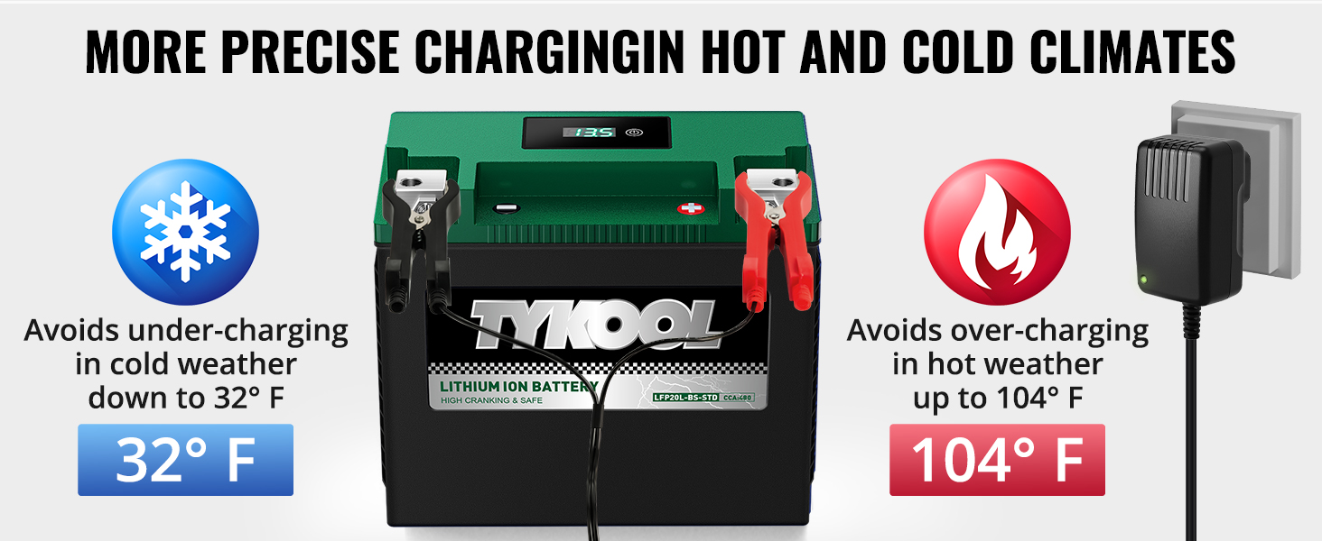 This TYKOOL lithium-ion battery charger automatically adjusts its charging profile based on ambient temperature—helping prevent under-charging in cold conditions down to 32°F and avoiding over-charging in heat up to 104°F. The result is safer, more consistent charging and better battery performance year-round.