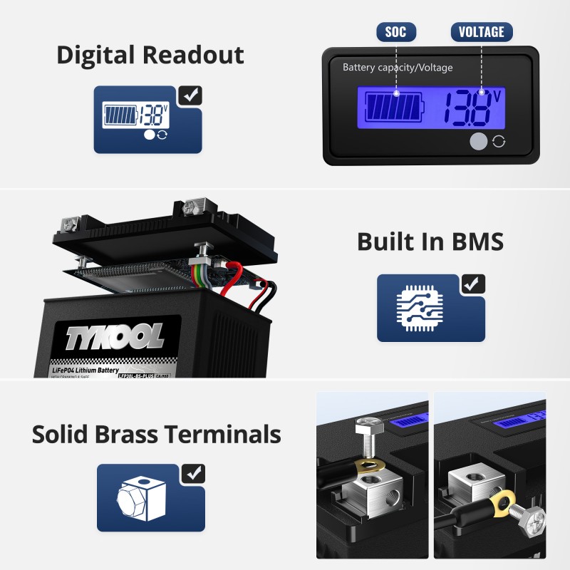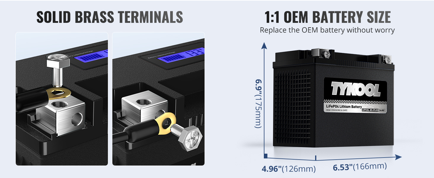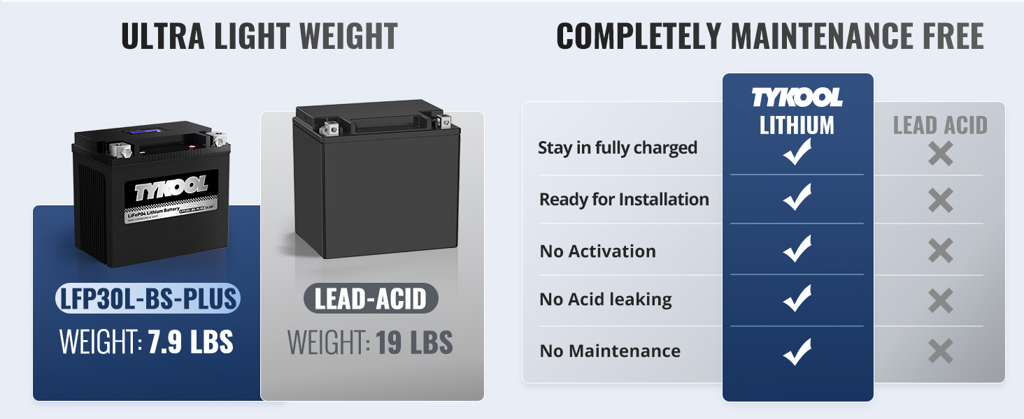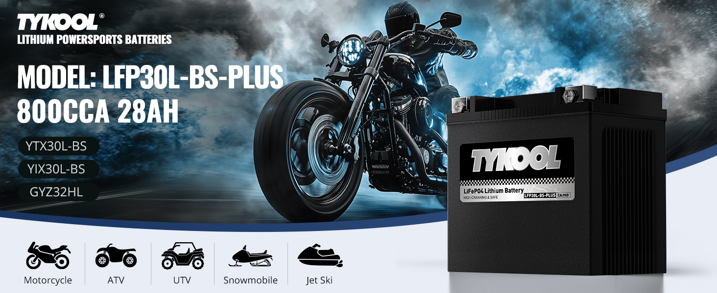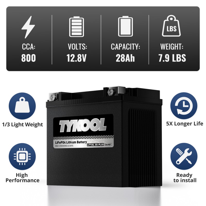 Engineered with advanced LiFePO4 technology, the TYKOOL LFP30L-BS-PLUS is designed to deliver powerful starting performance, dependable safety, and long-lasting reliability for a wide range of powersports applications. As a high-performance replacement for YTX30L-BS, YIX30L-BS, and GYZ32HL, it provides strong 800CCA output and 28Ah capacity in a lightweight, modern design. Whether for motorcycles, ATVs, UTVs, or snowmobiles, this battery is built to support demanding rides with stable, efficient power you can trust.