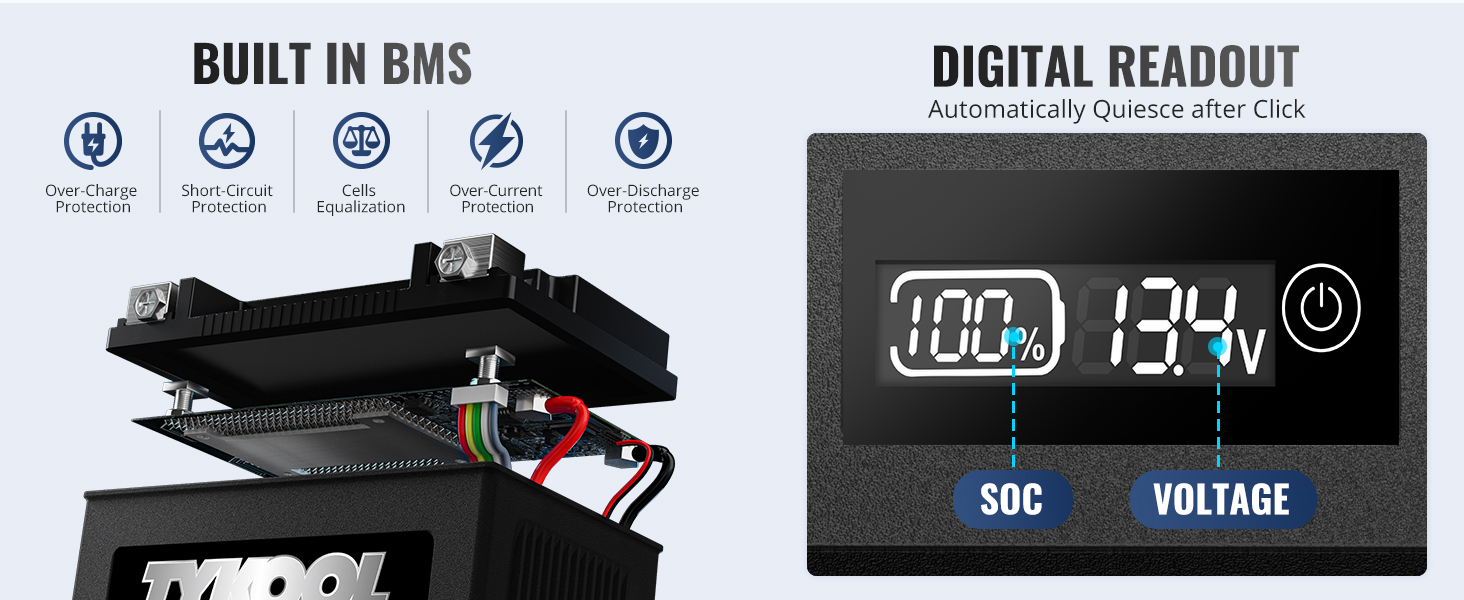 The advanced built-in BMS provides reliable protection against over-charge, over-discharge, over-current, and short-circuit conditions, while also supporting cell equalization for enhanced battery safety and stability. Paired with a smart digital readout, it allows you to easily monitor the battery’s SOC and voltage at a glance. With an automatic quiesce function after click, this design helps reduce power consumption while delivering convenient, user-friendly operation.