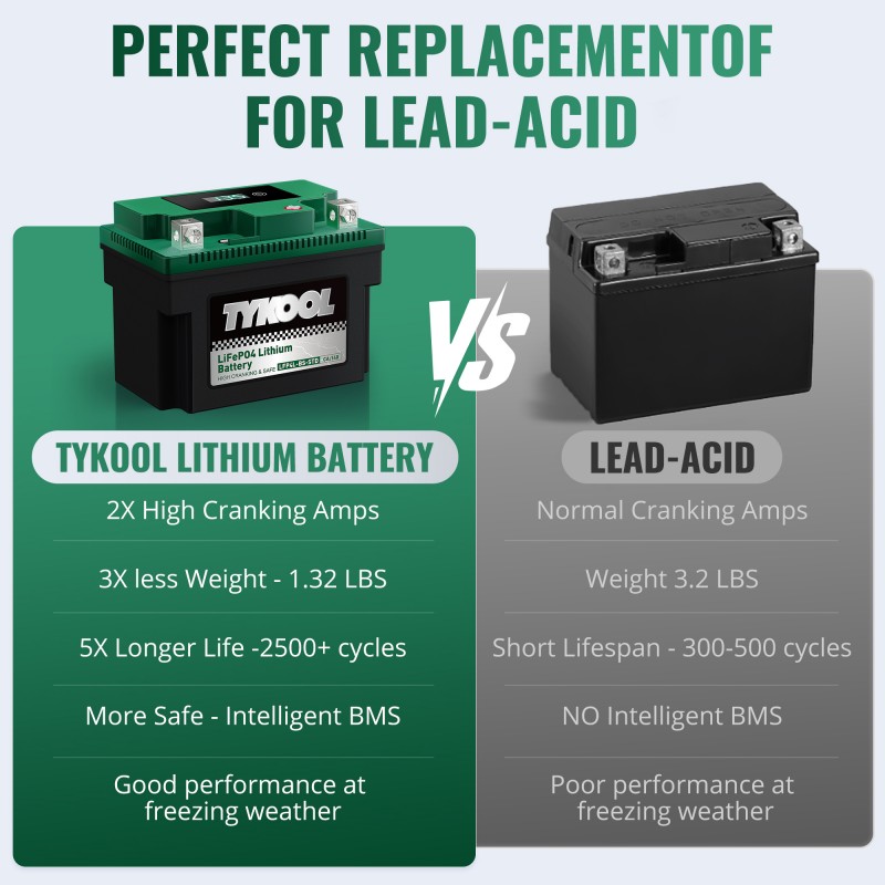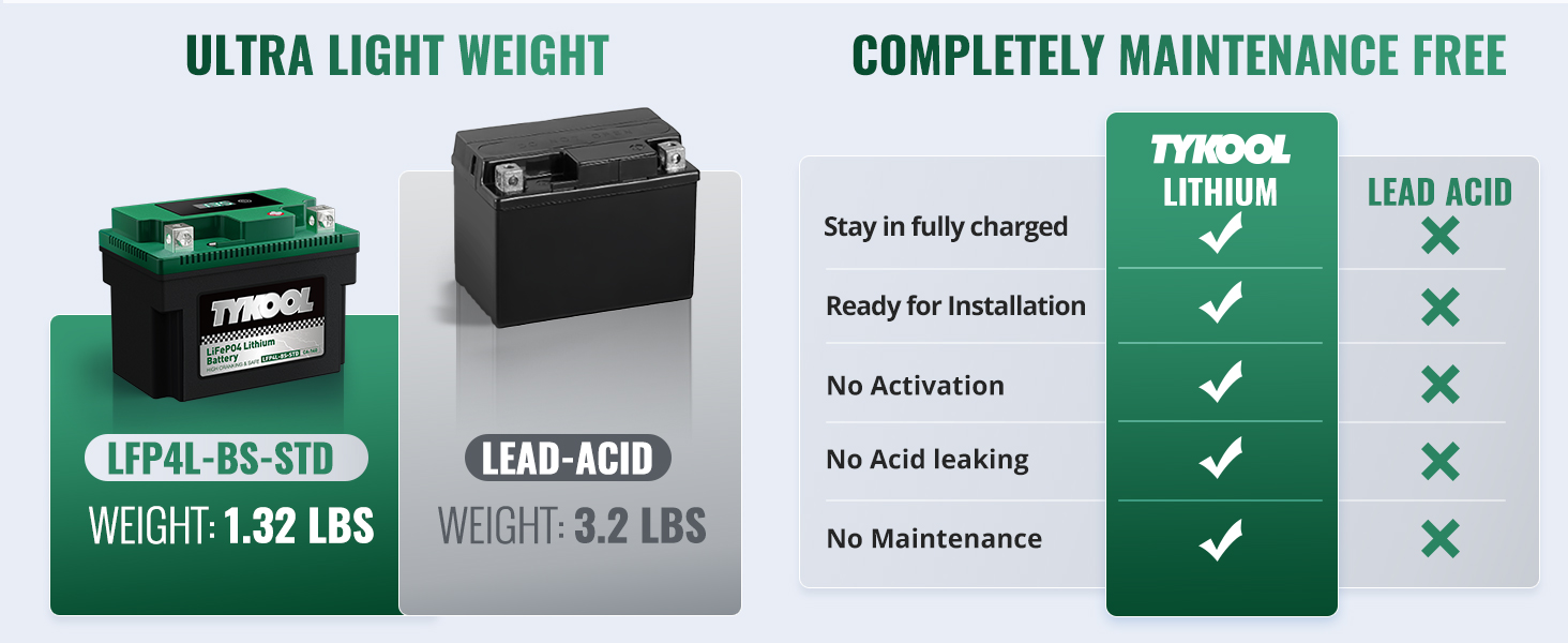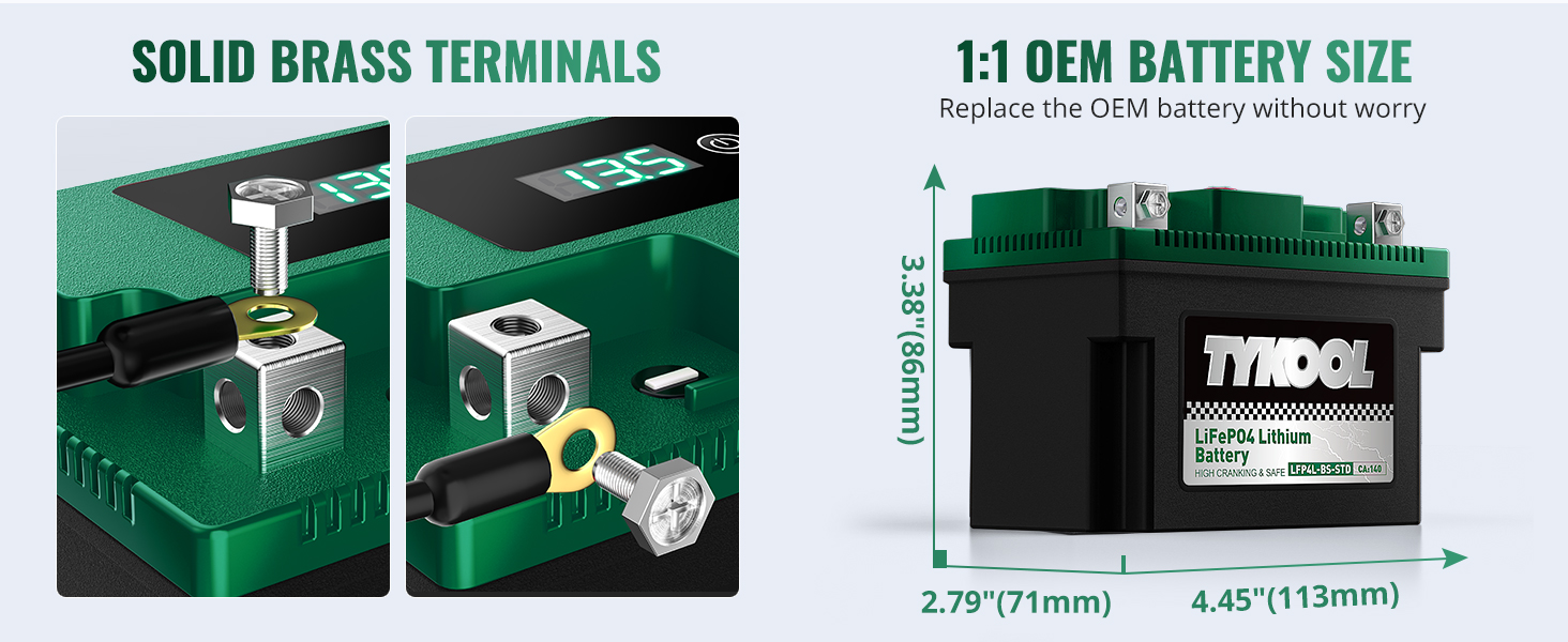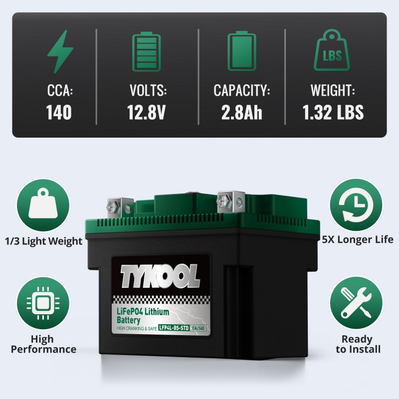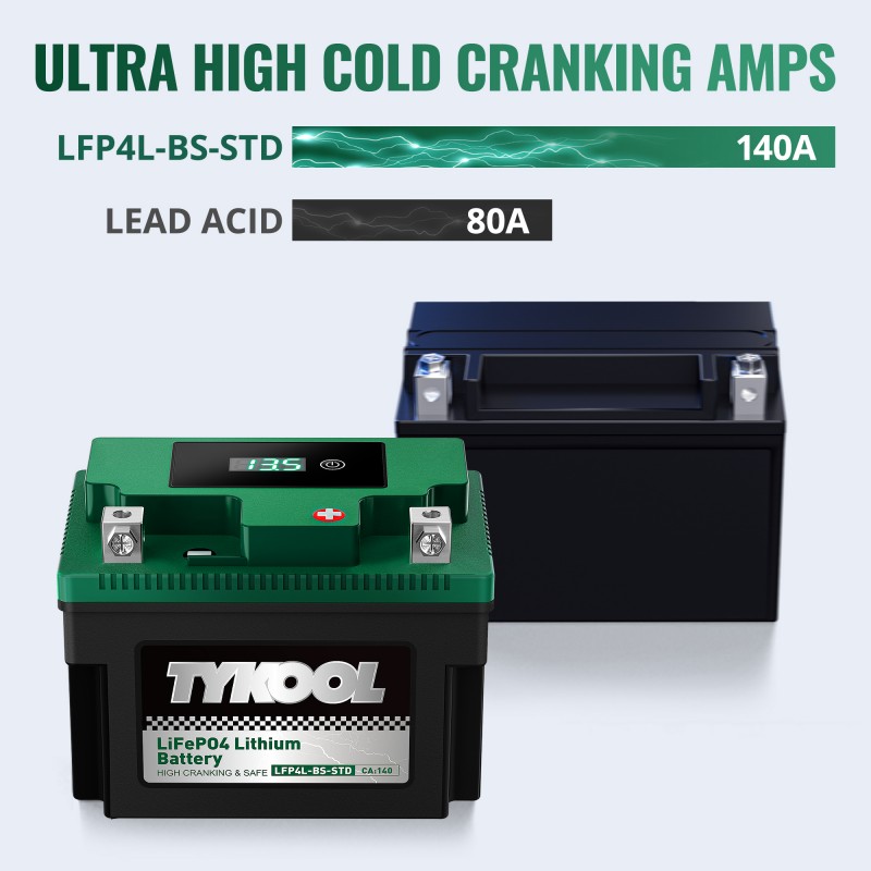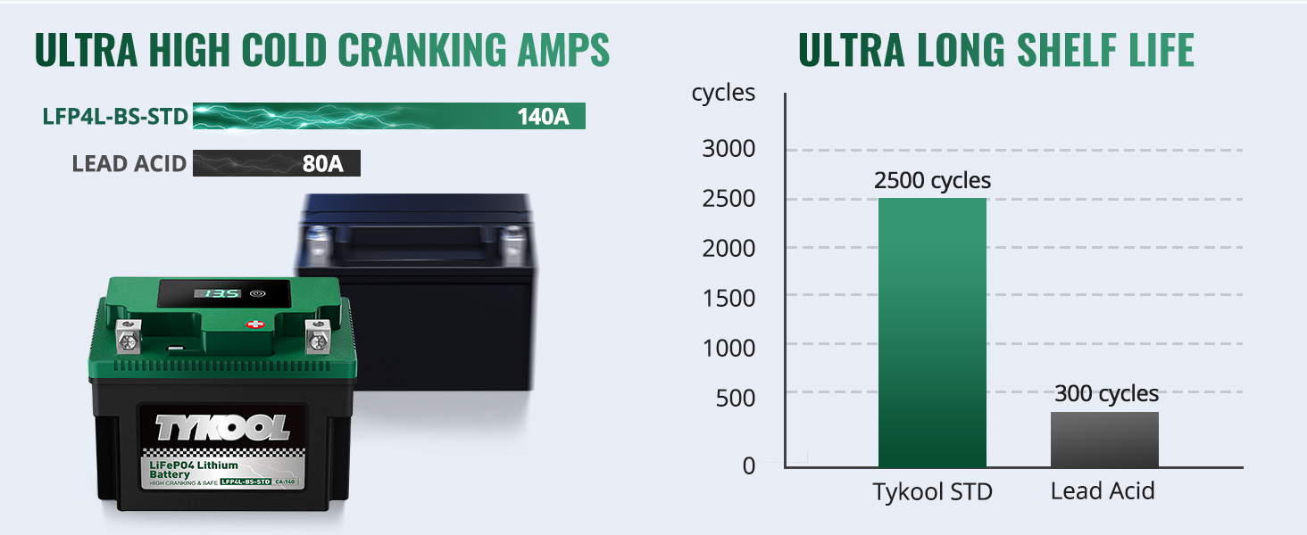 Experience unmatched starting power with an impressive cold cranking amps (CCA) rating of 140A, outperforming traditional lead-acid batteries (80A). Whether you're riding in cold weather or facing tough starts, this battery ensures reliable and efficient performance for your motorcycle, even in the harshest conditions.