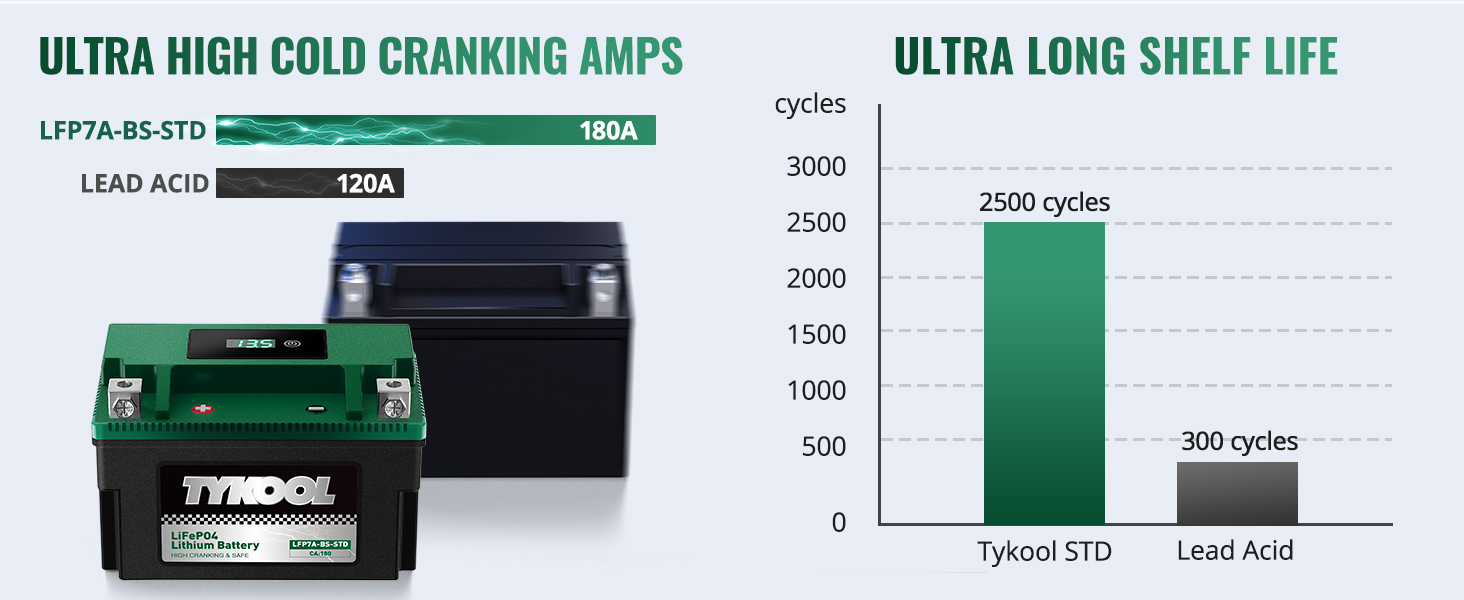 Experience superior power with ultra-high cold-cranking amps, delivering 180A compared to the 120A of traditional lead-acid batteries. This battery also boasts an impressive lifespan of up to 2500 charge cycles, significantly outlasting the 300 cycles of conventional lead-acid options. Choose a solution that offers both power and longevity for your vehicle.